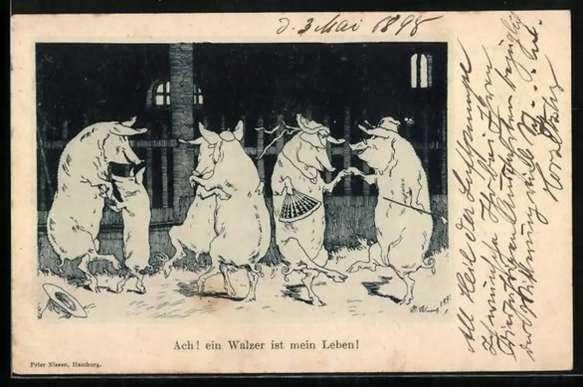 AK Schweine beim fröhlichen Tanz im Stall, Ach ! Ein Walzer ist mein Leben! vermenschlichte Tiere