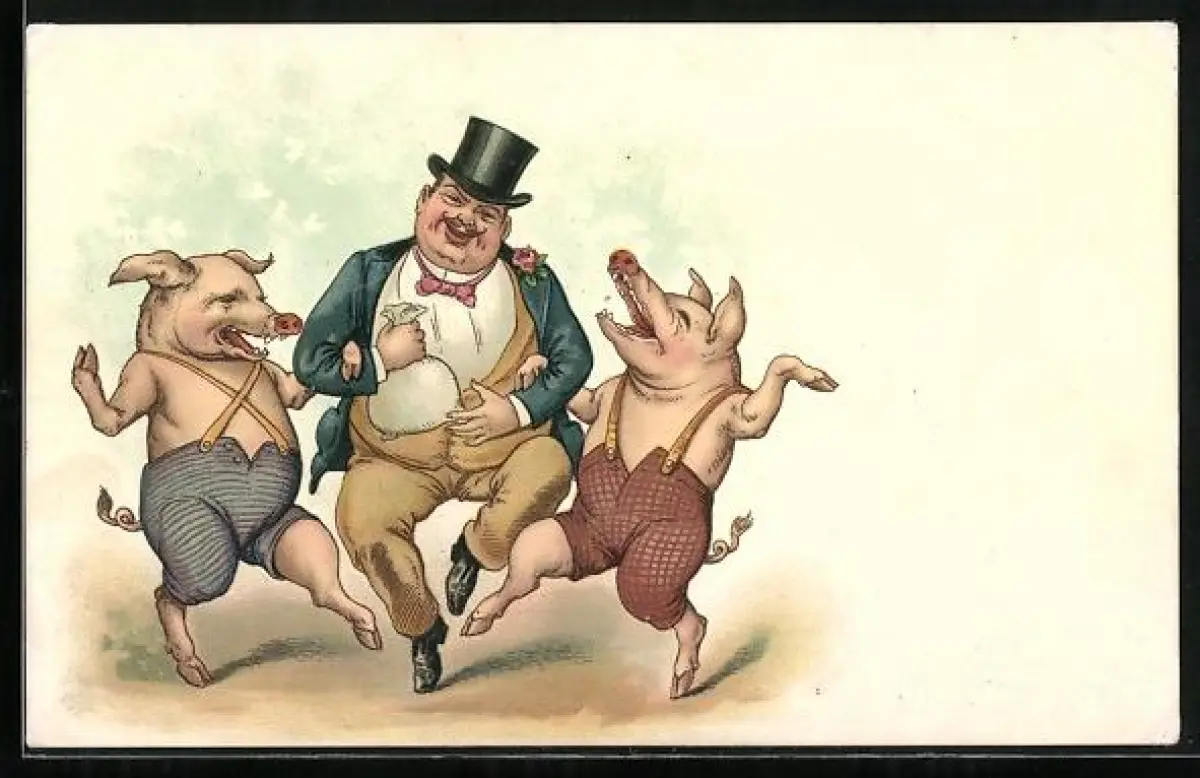 AK Schweine tanzen ausgelassen mit dem reichen Mann, der einen Geldsack in der Hand hält, vermenschlichte Tiere
