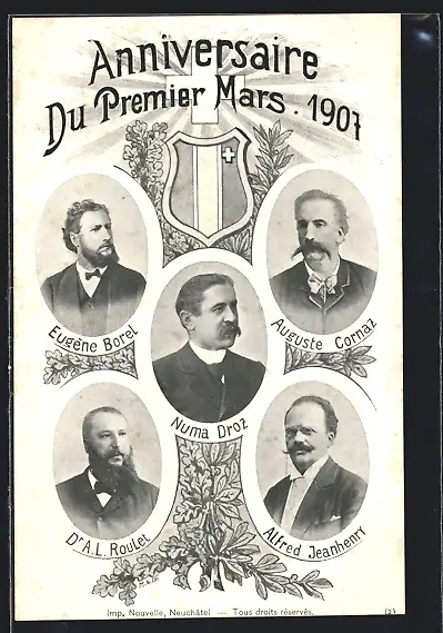 AK Schweiz, Anniversaire du Premier Mars 1907, Eugene Borel, Numa Droz, Auguste Cornaz