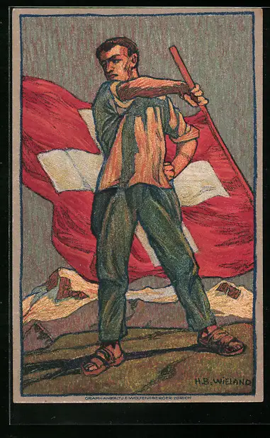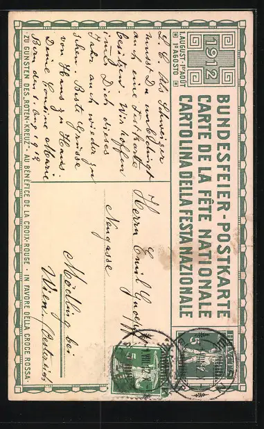AK Schweizer Bundesfeier 1912, Mann mit Schweizer Flagge, Ganzsache