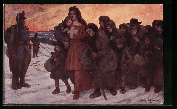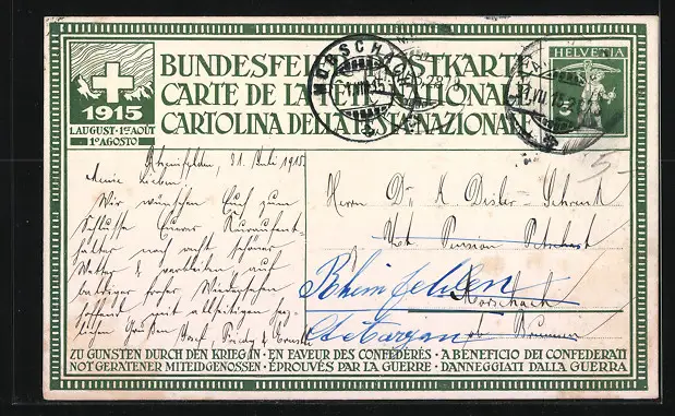 AK Schweizer Bundesfeier 1915, Flüchtlinge schmiegen sich an Helvetia, Ganzsache