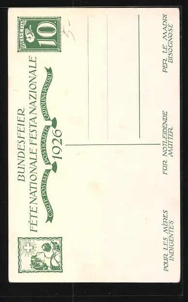 AK Schweizer Bundesfeier 1926, Mutter wacht über das Kind in der Wiege, Ganzsache
