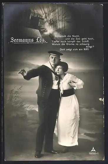 AK Seemanns Los, Matrose mit junger Frau vor einer Strandkulisse