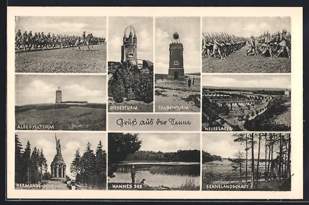 AK Senne, Diebesturm, Taubenturm, Hermann-Denkmal, Hannes See, Sennelandschaft, neues Lager