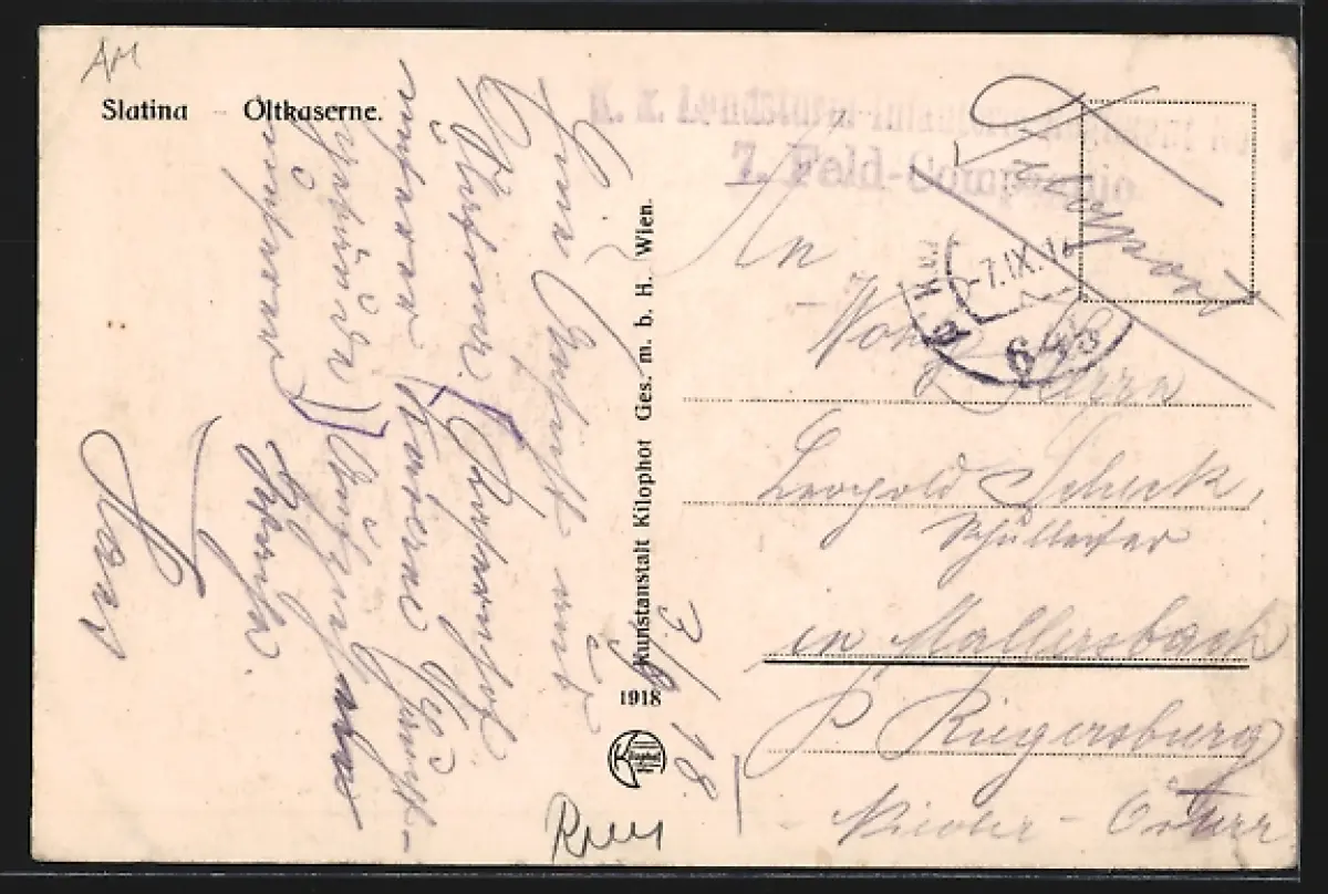 Personenbezogene Daten auf der Rückseite der Karte wurden durch blauen Textmarker unkenntlich gemacht. Die blauen Stellen sind auf die Vorderseite durchgeweicht und wirken sich negativ auf das Postkartenfoto aus