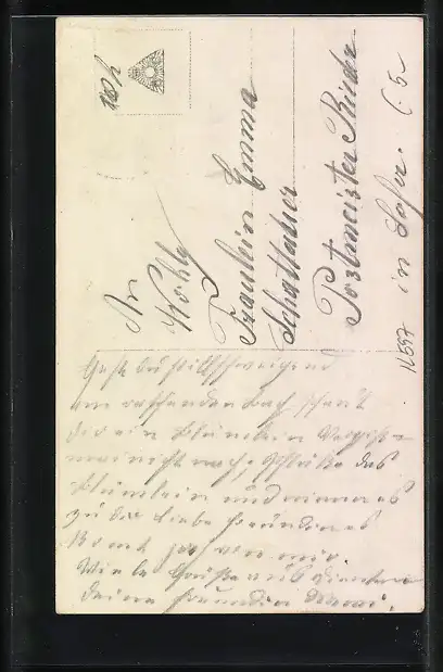 Personenbezogene Daten auf der Rückseite der Karte wurden durch blauen Textmarker unkenntlich gemacht. Die blauen Stellen sind auf die Vorderseite durchgeweicht und wirken sich negativ auf das Postkartenfoto aus