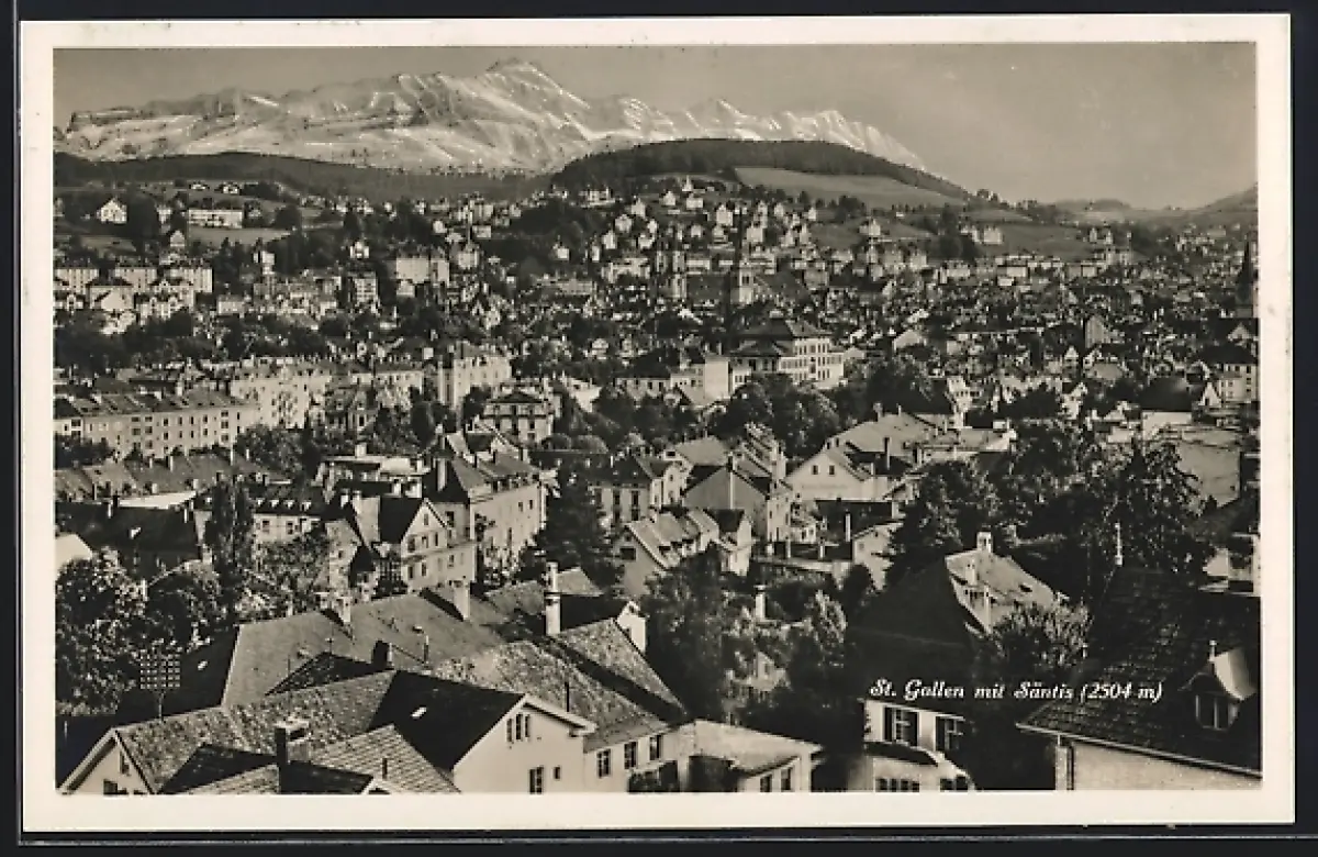 AK St. Gallen, Blick über die Dächer mit Bergen