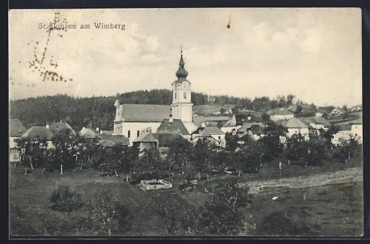 AK St. Johann am Wimberg, Ortsansicht mit Kirche vom Ortsrand aus