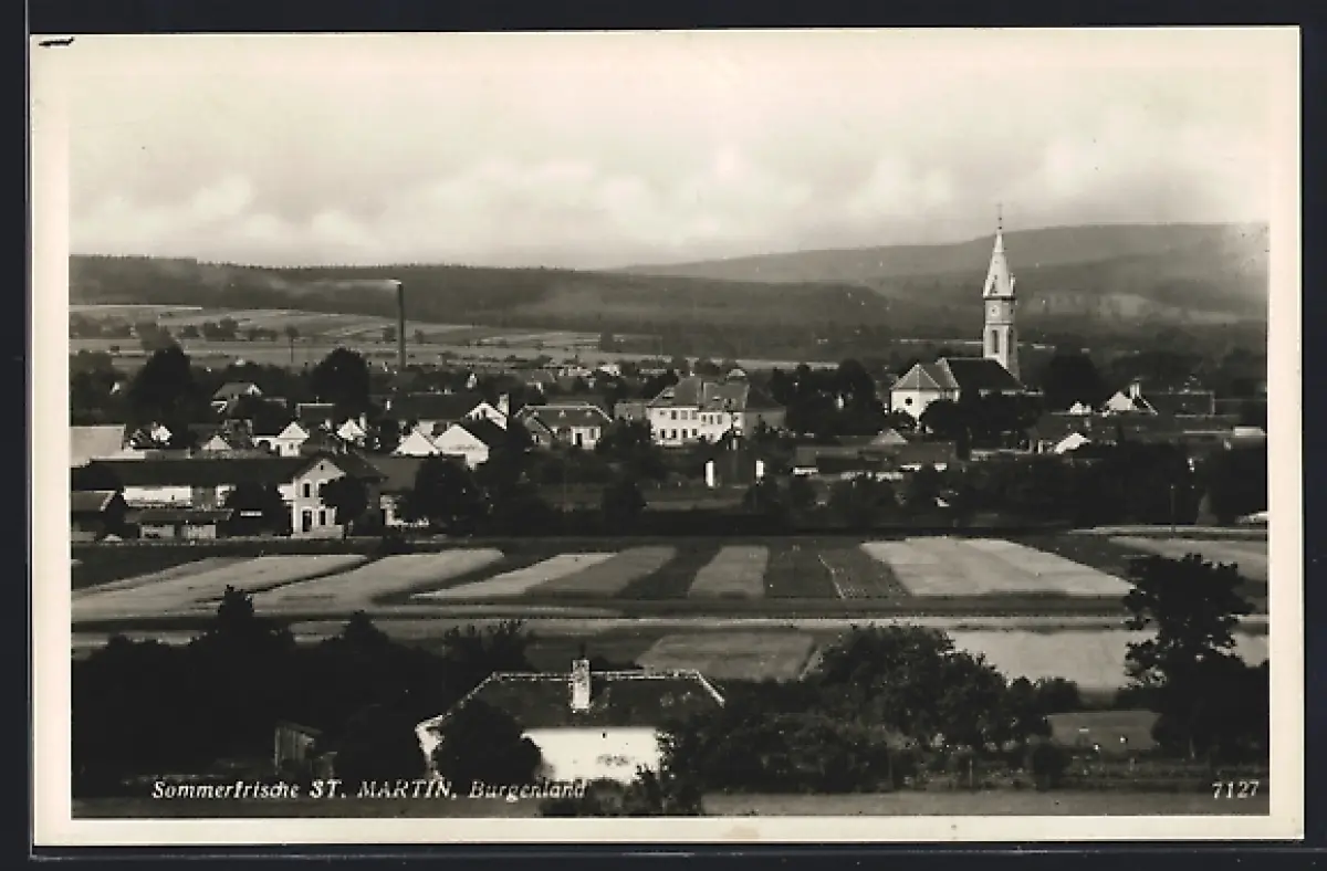 AK St. Martin /Burgenland, Ortspanorama mit Feldern aus der Vogelschau