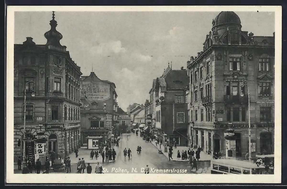 AK St. Pölten, Blick in die Kremserstrasse, Litfasssäule