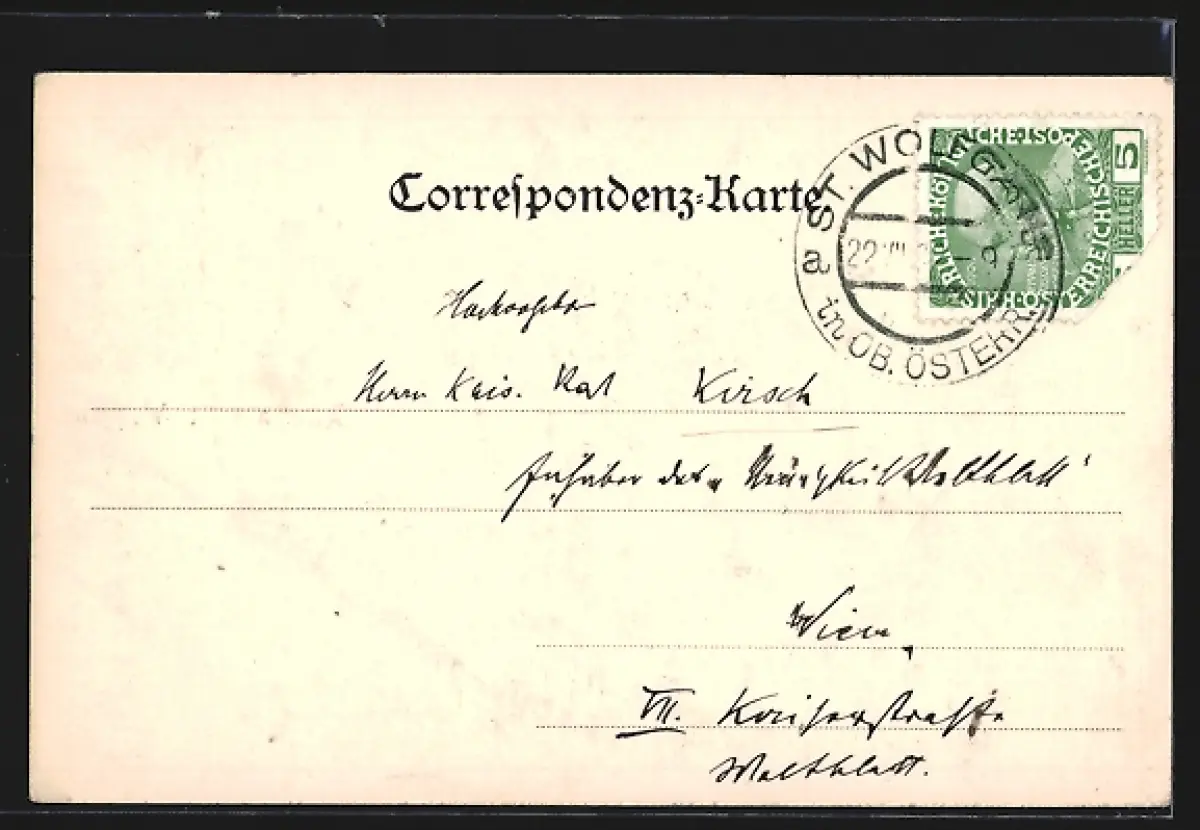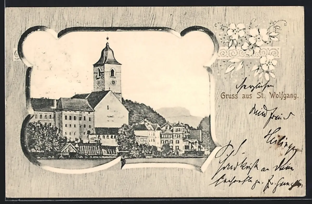 AK St. Wolfgang /Salzkammergut, Teilansicht mit Kirchturm im Passepartout
