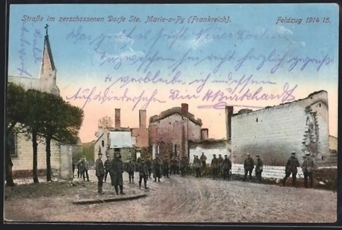 AK Ste. Marie-a-Py, deutsche Soldaten im zerschossenen Dorf