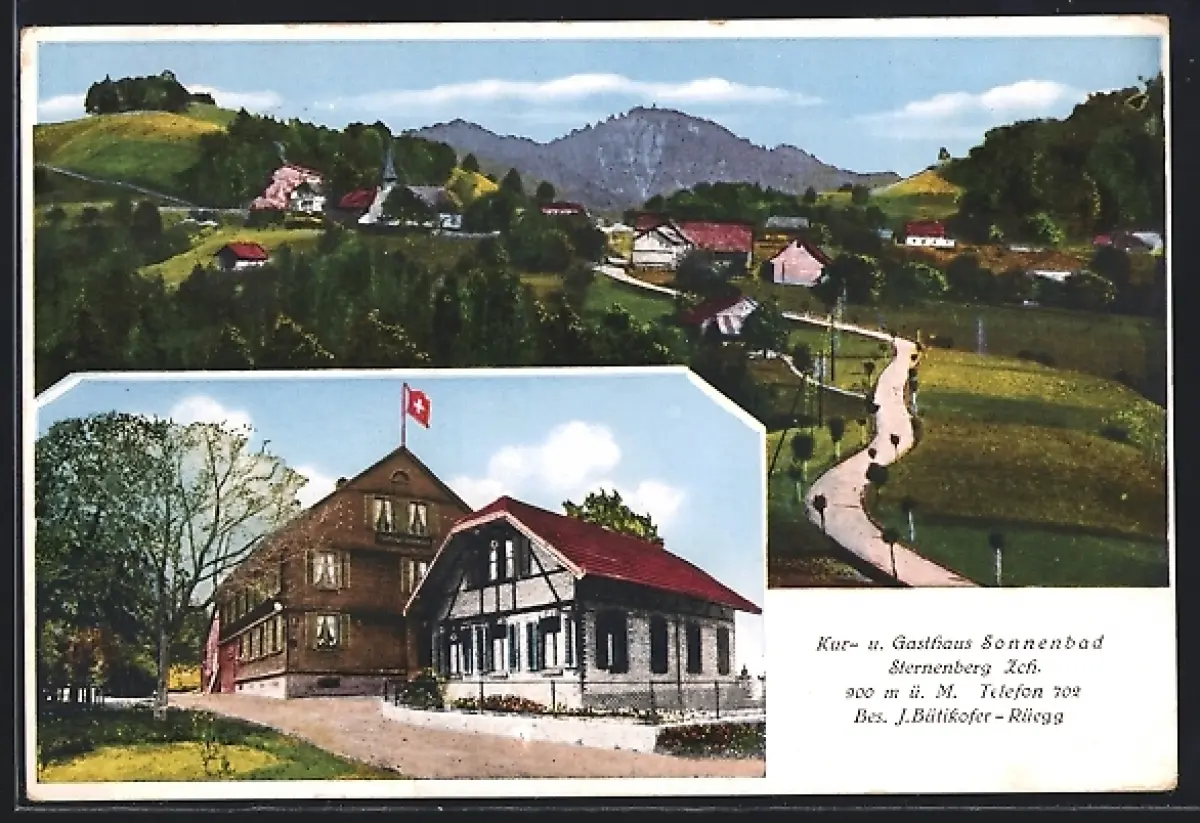 AK Sternenberg /Zch., Gasthaus Sonnenbad, Inh. J. Bütikofer-Rüegg, und Ortspanorama