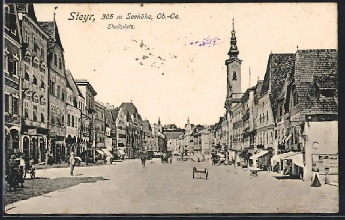 AK Steyr /O.-Ö., Stadtplatz mit Geschäften u. Turmgebäude