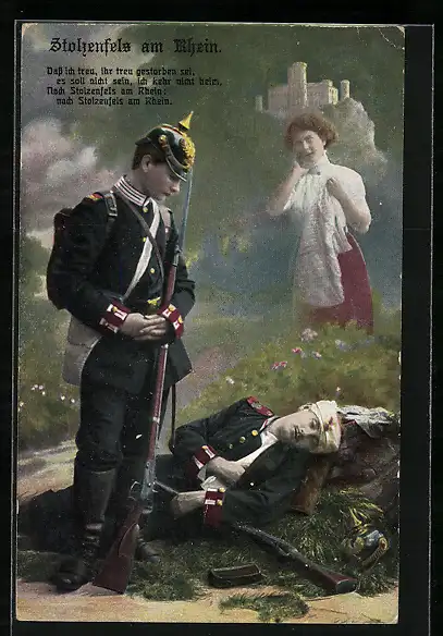 AK Stolzenfels /Rh., Sterbender Soldat und trauernde Braut, Burg, Rotes Kreuz