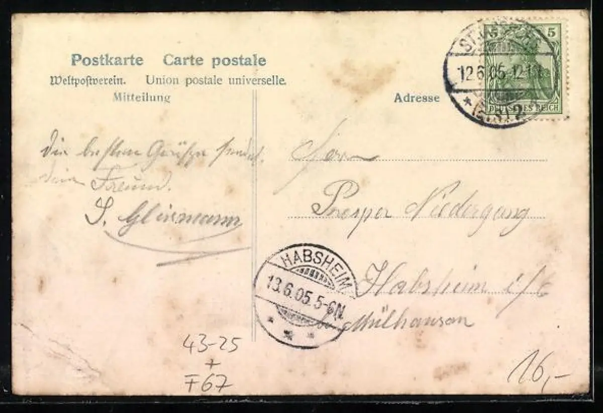 alte Ansichtskarte, gelaufen 1905, Eckknicke li. oben und re. unten, Bugspur re. mittig, guter Zustand