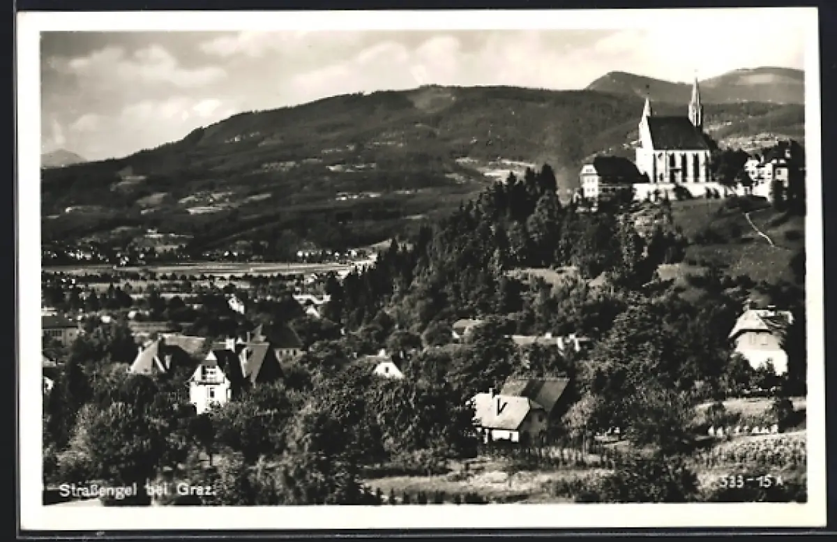 AK Strassengel bei Graz, Ortsansicht mit Kirche aus der Vogelschau