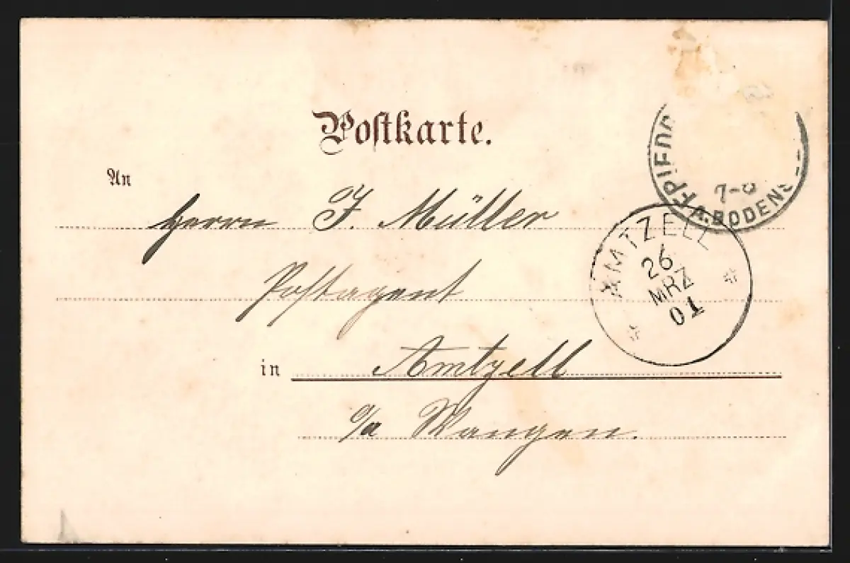 alte Ansichtskarte, gelaufen 1901, Briefmarke entfernt, rückseitig Oberflächenschaden, guter Zustand