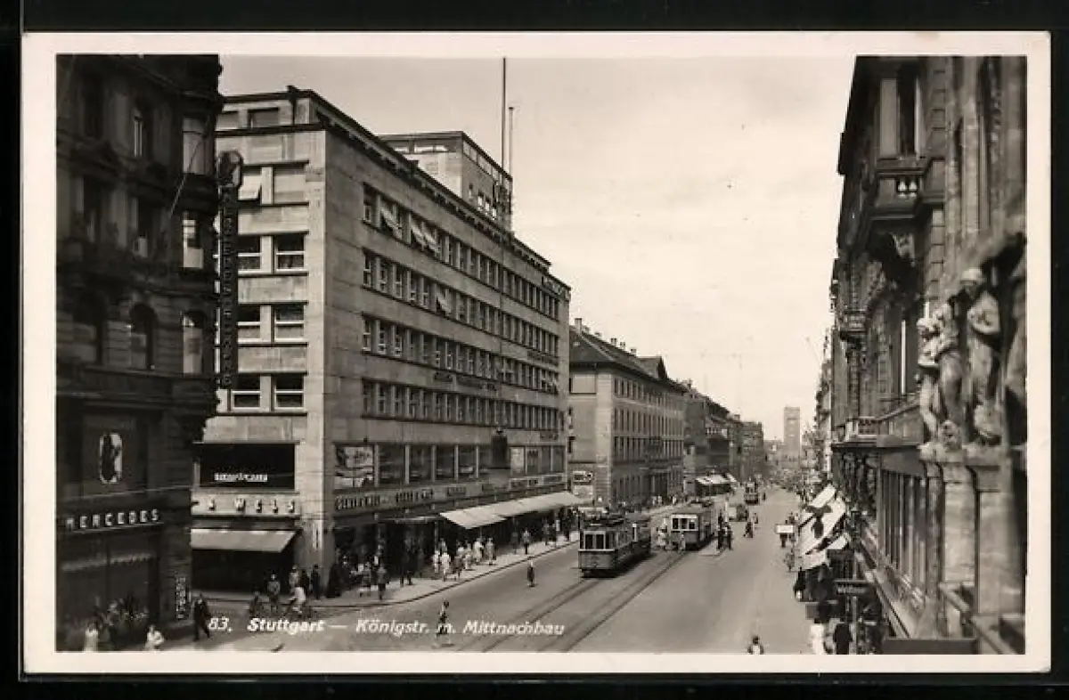 AK Stuttgart, Königstrasse mit Mittnachbau und Geschäften, Strassenbahn