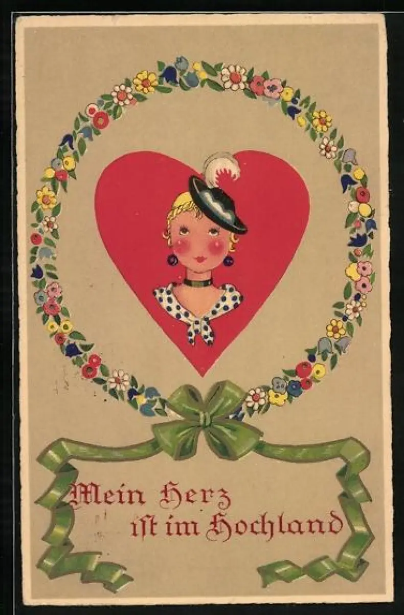 AK Süsses junges Mädchen in einem Herzen mit Blumenkranz