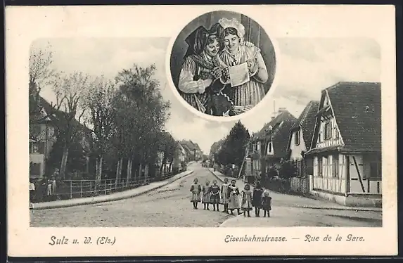 AK Sulz, Eisenbahnstrasse mit Kindern, Elsässerin in ortstypischer Tracht