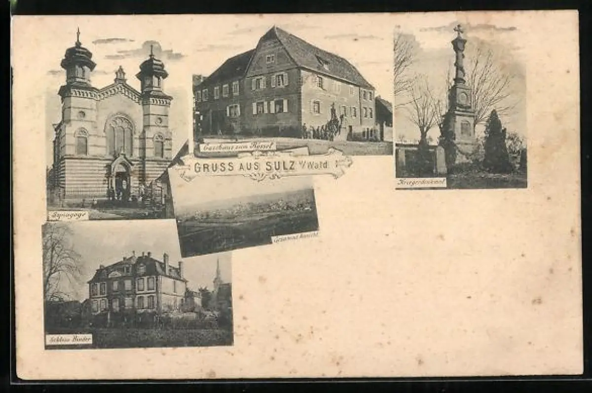 AK Sulz u. Wald, Synagogue, Gasthaus zum Rössl, Schloss Binder, Kriegerdenkmal