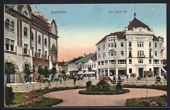 AK Szabadka, Szt. Istvan ter, Strassenleben mit Parkanlage
