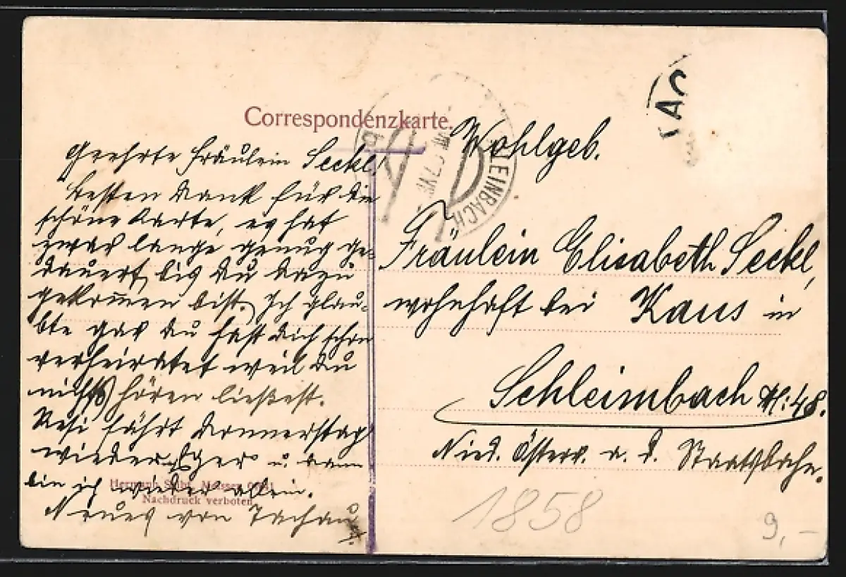 Personenbezogene Daten auf der Rückseite der Karte wurden durch blauen Textmarker unkenntlich gemacht. Die blauen Stellen sind auf die Vorderseite durchgeweicht und wirken sich negativ auf das Postkartenfoto aus