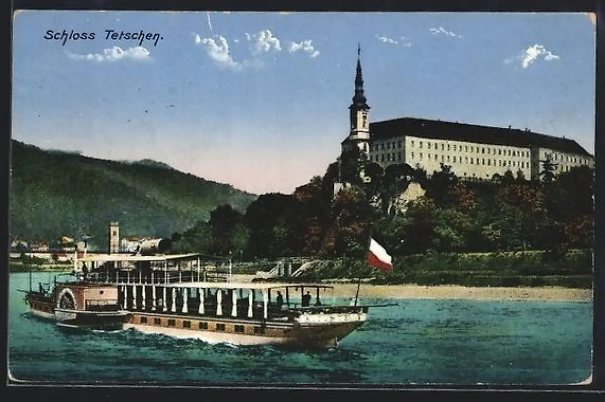 AK Tetschen, Raddampfer am Schloss