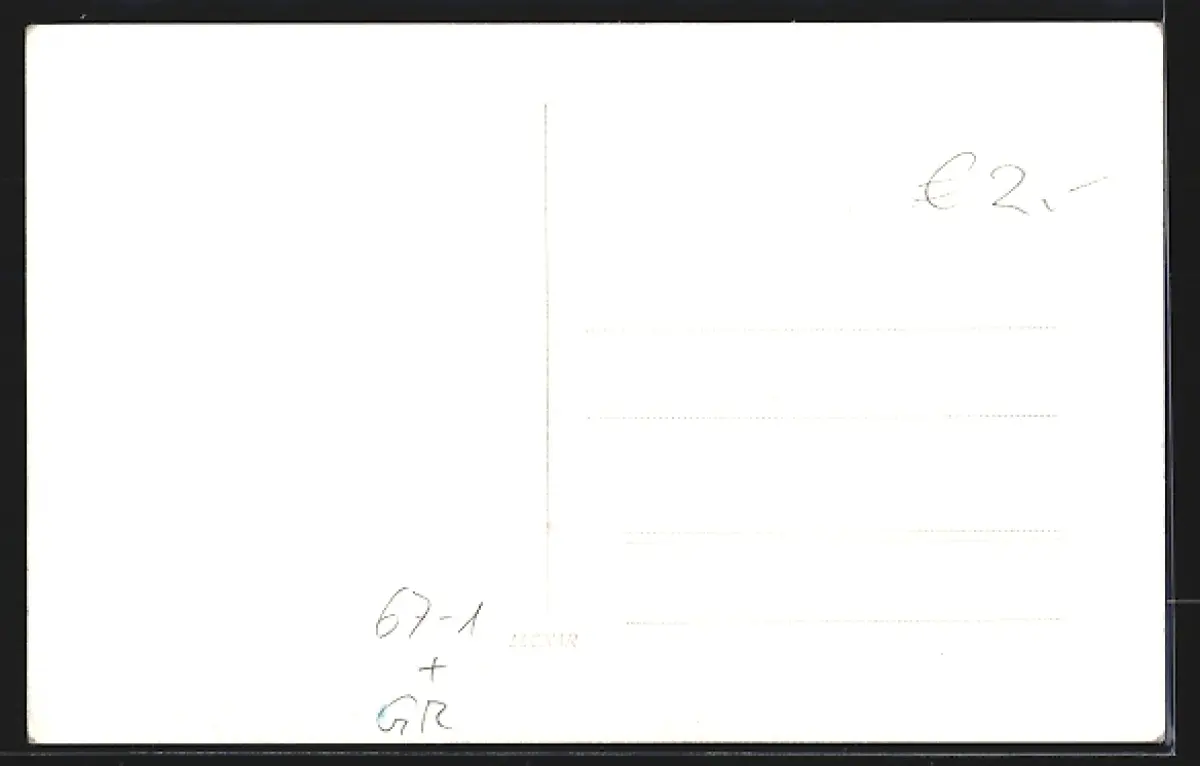Personenbezogene Daten auf der Rückseite der Karte wurden durch blauen Textmarker unkenntlich gemacht. Die blauen Stellen sind auf die Vorderseite durchgeweicht und wirken sich negativ auf das Postkartenfoto aus