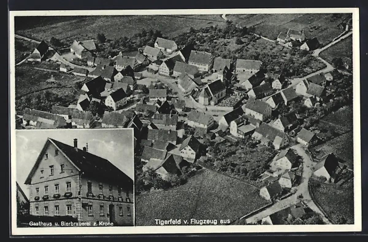 AK Tigerfeld, Gasthaus und Bierbrauerei zur Krone, Eugen Ruf, Ortsansicht vom Flugzeug aus