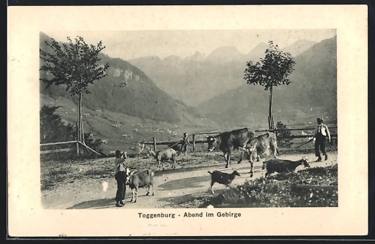 AK Toggenburg, Bauern treiben das Vieh zurück in den Stall, Abend im Gebirge