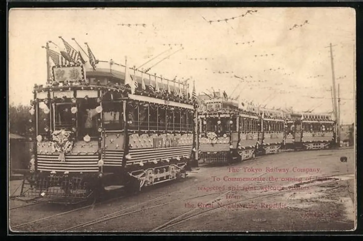 AK Tokyo, Tokyo Railway Company welcomes foreign visitors 1908, Strassenbahn