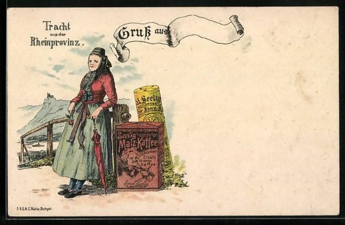AK Tracht aus der Rheinproviz, Reklame für Malz-Kaffee Seelig