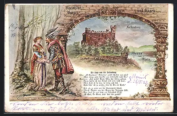 AK Trechtinghausen, Blick auf die Falckenburg, mit historischen Liebespaar
