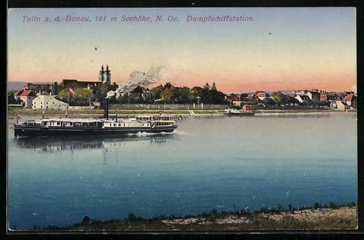 AK Tulln a. d. Donau, Ortsansicht mit Dampfer