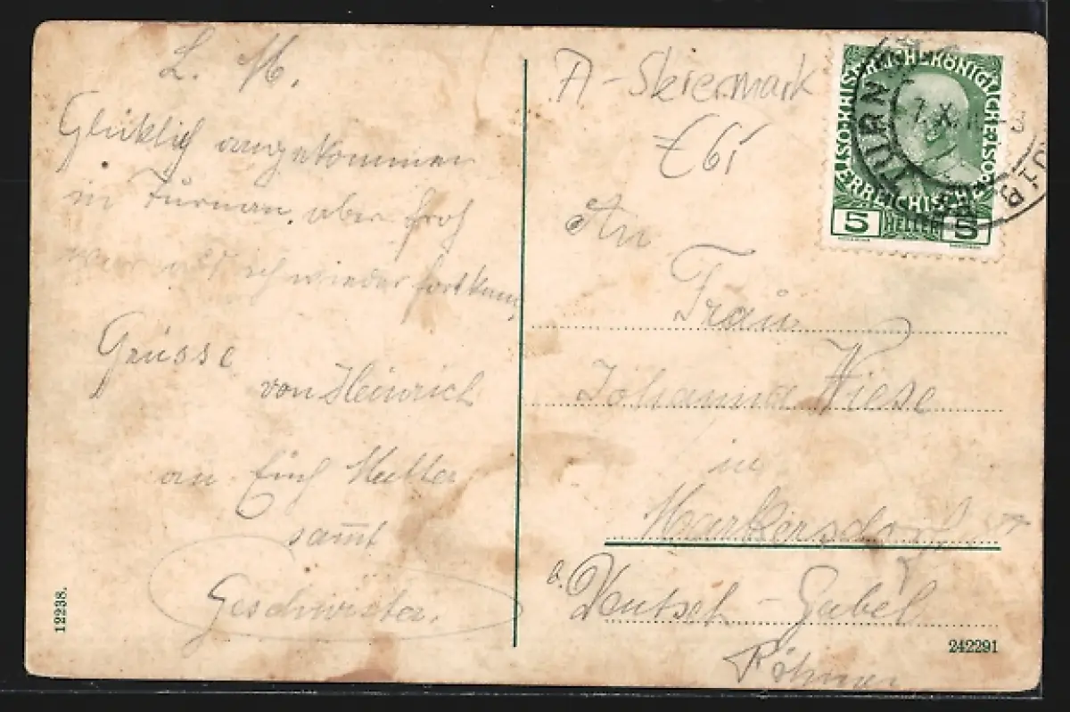 Personenbezogene Daten auf der Rückseite der Karte wurden durch blauen Textmarker unkenntlich gemacht. Die blauen Stellen sind auf die Vorderseite durchgeweicht und wirken sich negativ auf das Postkartenfoto aus