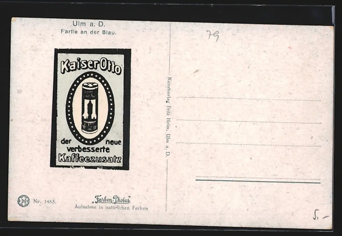 Personenbezogene Daten auf der Rückseite der Karte wurden durch blauen Textmarker unkenntlich gemacht. Die blauen Stellen sind auf die Vorderseite durchgeweicht und wirken sich negativ auf das Postkartenfoto aus