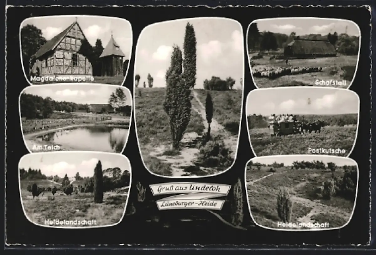 AK Undeloh /Lüneburger Heide, Magdalenenkapelle, Schafstall, Heidelandschaften, Teich u. Postkutsche