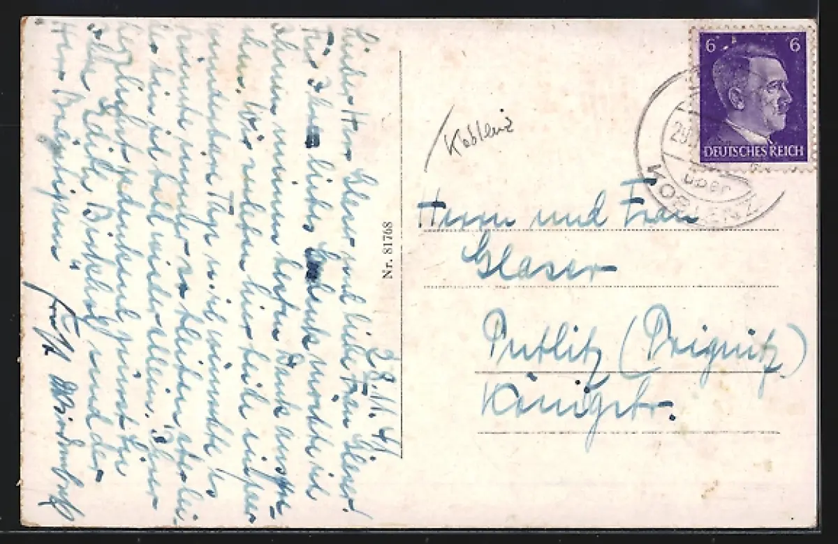 Personenbezogene Daten auf der Rückseite der Karte wurden durch blauen Textmarker unkenntlich gemacht. Die blauen Stellen sind auf die Vorderseite durchgeweicht und wirken sich negativ auf das Postkartenfoto aus