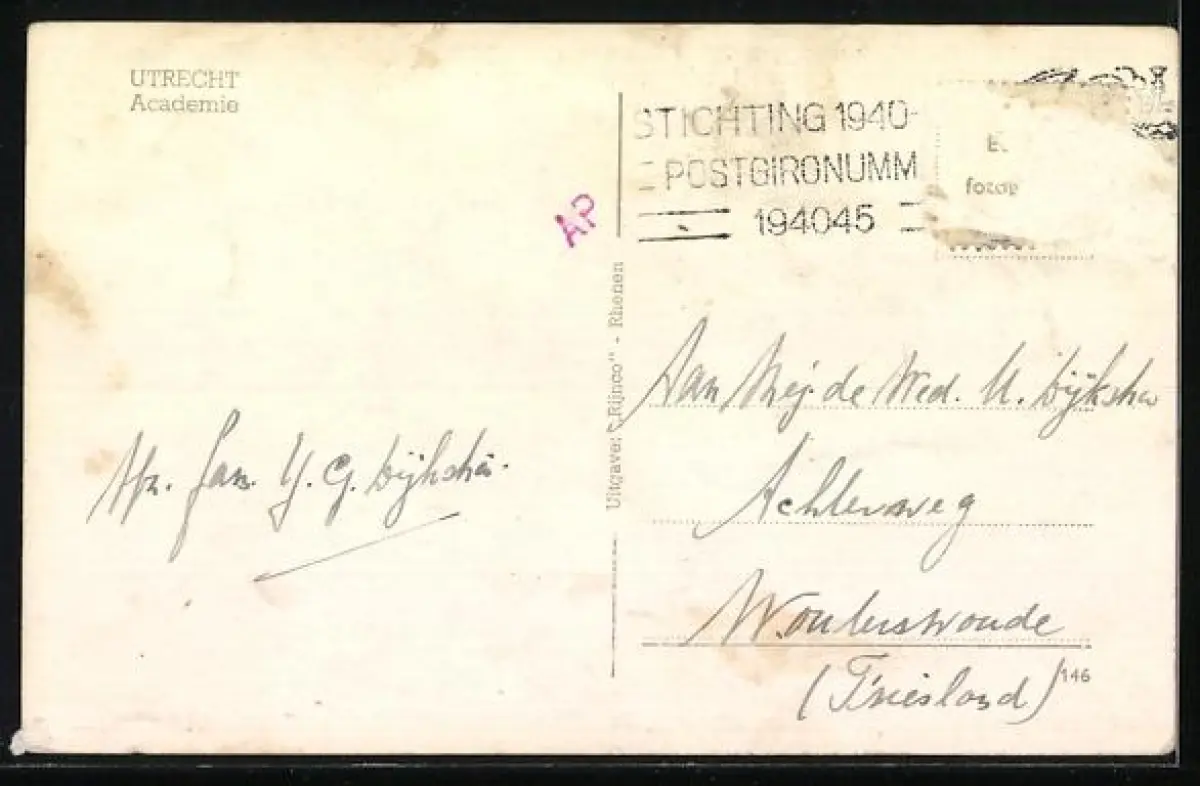 alte Ansichtskarte, gelaufen 1945, Briefmarke entfernt, rückseitig Oberflächenschaden, Eckknick re. oben, guter Zustand