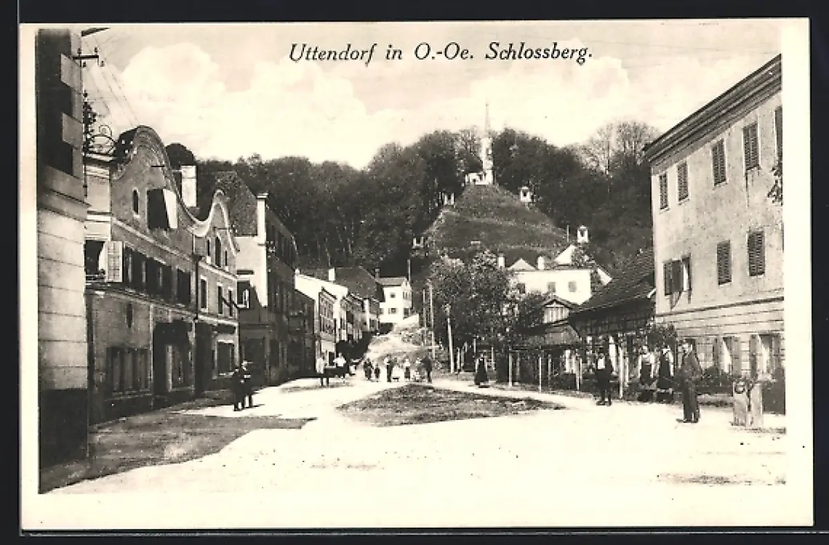 AK Uttendorf i. O.-Oe., Strassenpartie mit Schlossberg