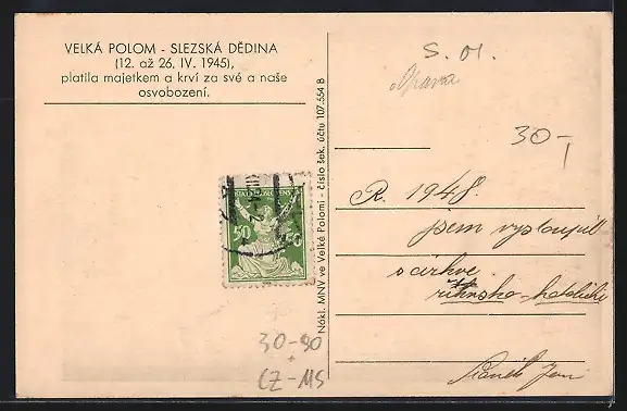 AK Velka Polom, Slezska Dedina 1945, zerstörte Gebäude
