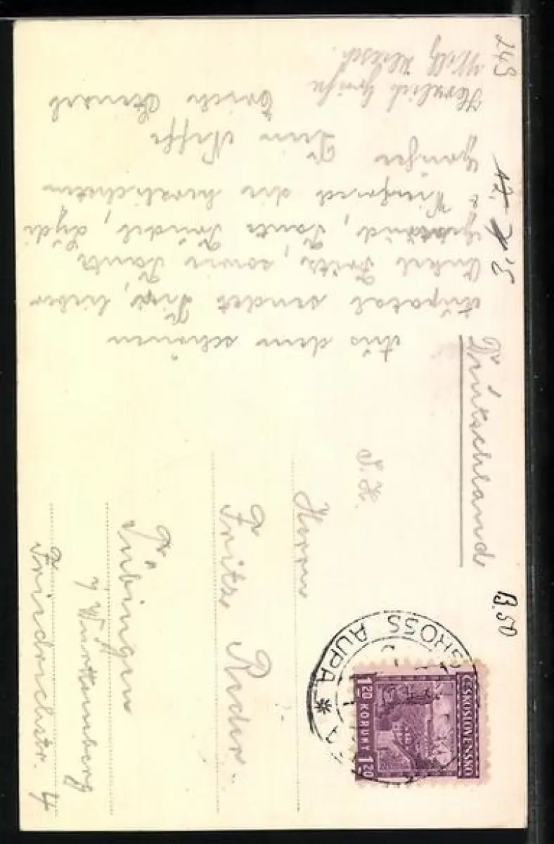 Personenbezogene Daten auf der Rückseite der Karte wurden durch blauen Textmarker unkenntlich gemacht. Die blauen Stellen sind auf die Vorderseite durchgeweicht und wirken sich negativ auf das Postkartenfoto aus