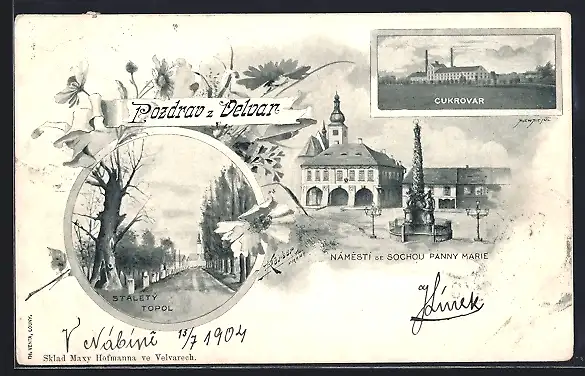 AK Velvary, Cukrovar, Stalety Topol, Námesti se Sochou Panny Marie