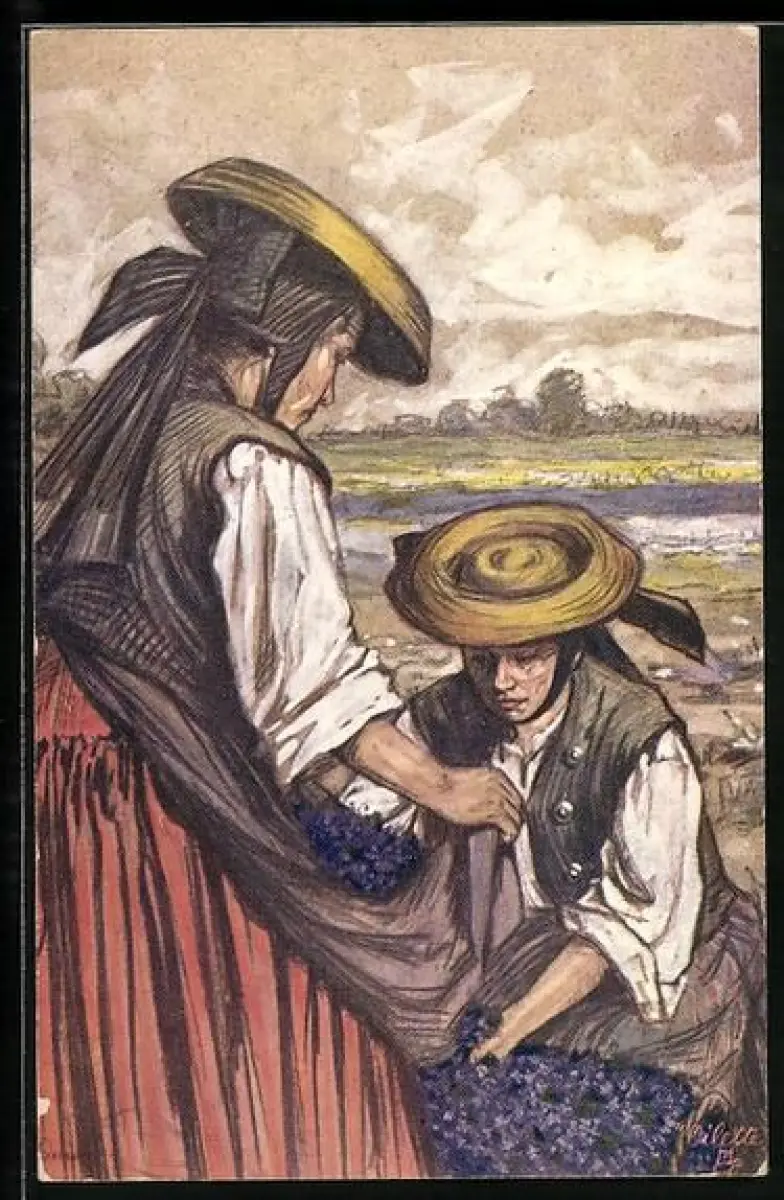 AK Vierländerinnen sammeln Blumen in der Schürze