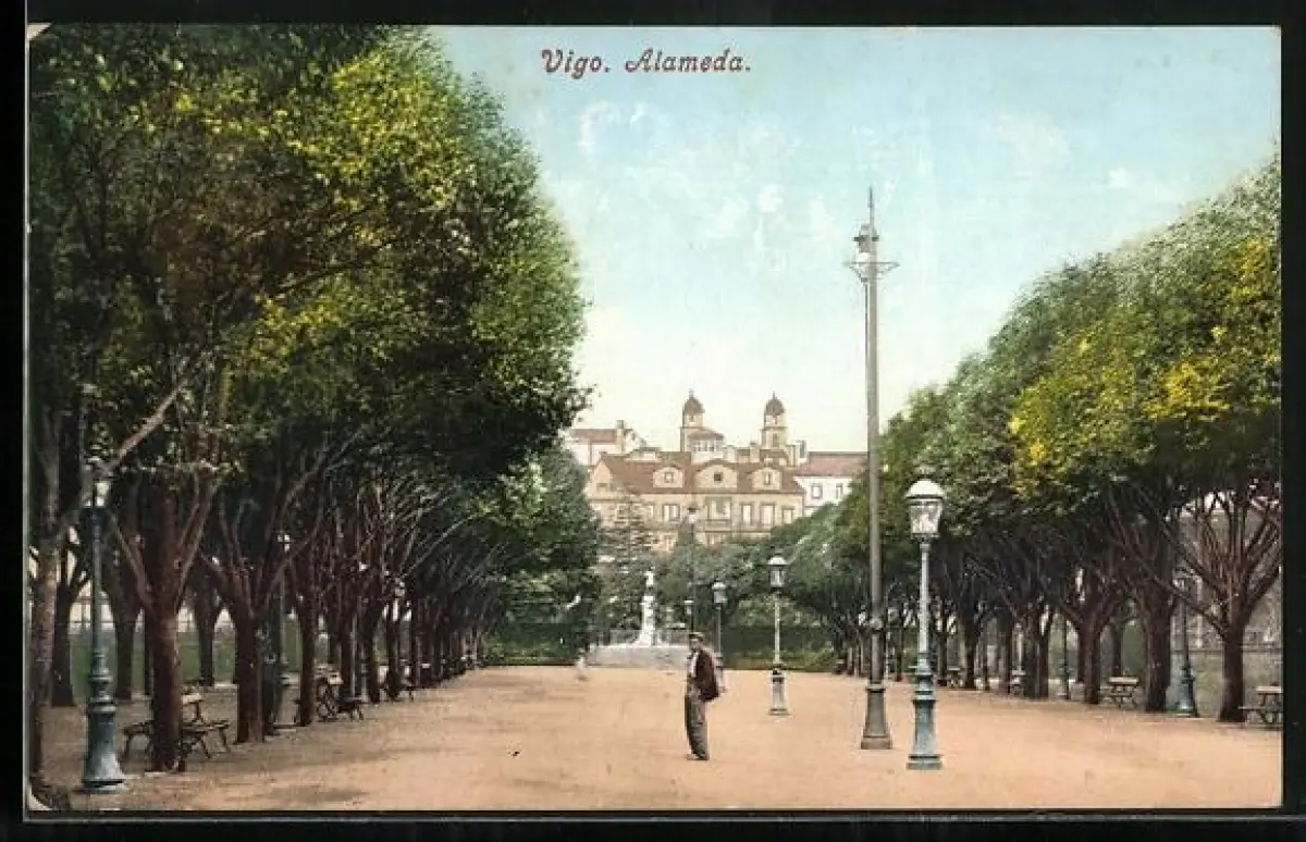 AK Vigo, Alameda, Passant auf der Allee vor dem Brunnen
