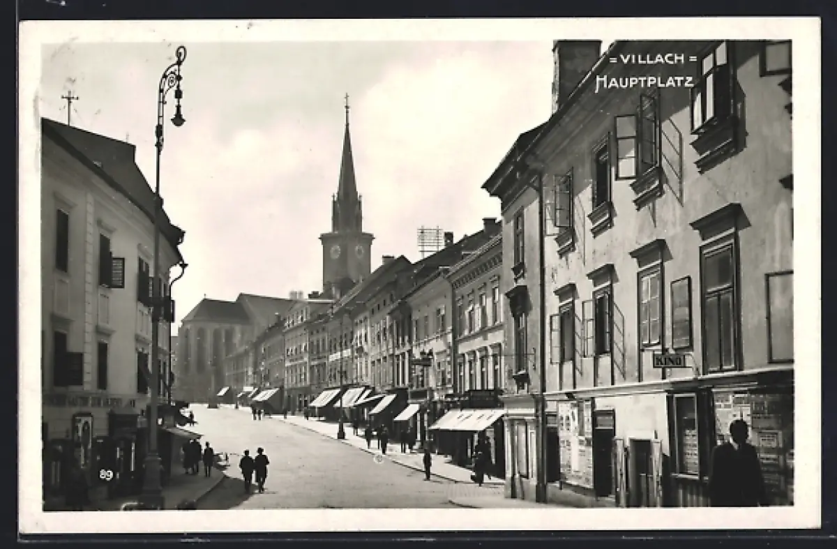 AK Villach, Hauptplatz mit Geschäften und Kirche