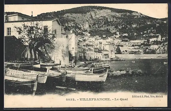 AK Villefranche, Le Quai avec bateaux amarrés et vue sur les collines