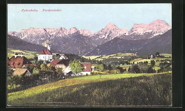 AK Vorderstoder, Pyhrnbahn an den Alpen mit Kirche